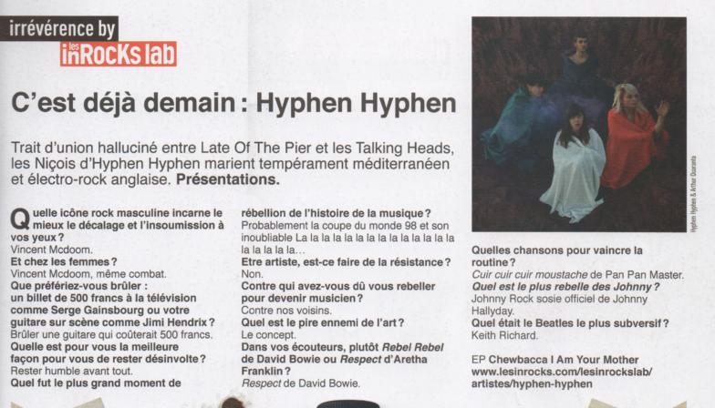 Il y une Interview des hyper talentueux nicois d’Hyphen-Hyphen dans les Inrockuptibles # 867 (du 11 au 17 Juillet)