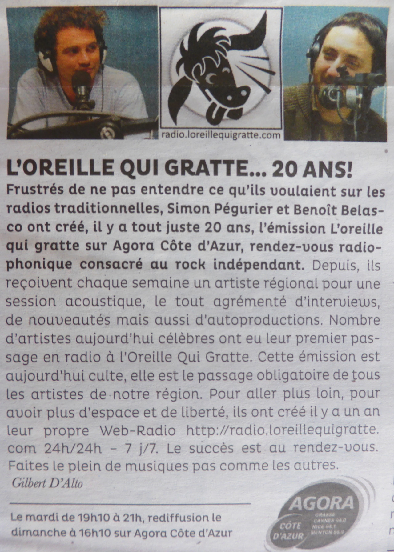 Frustrés de ne pas entendre ce qu’ils voulaient sur les radios traditionnelles il y a tout juste 20 ans Simon Pégurier et Benoît Belasco créent L’oreille qui gratte sur Agora Côte d’Azur , rendez vous radiophonique consacré au rock indépendant.